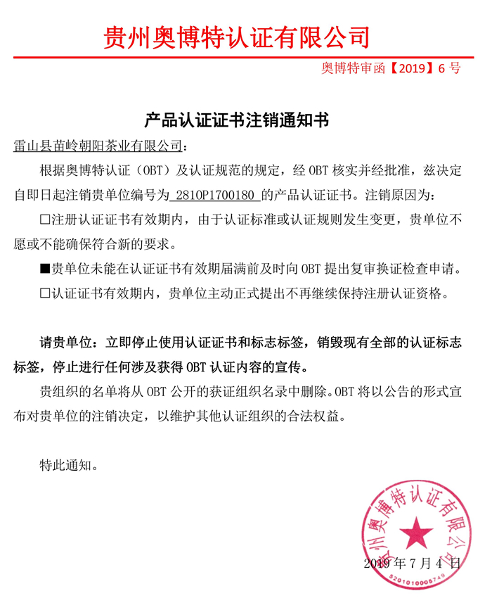 注銷雷山縣苗嶺朝陽茶業有限公司產品認證證書通知