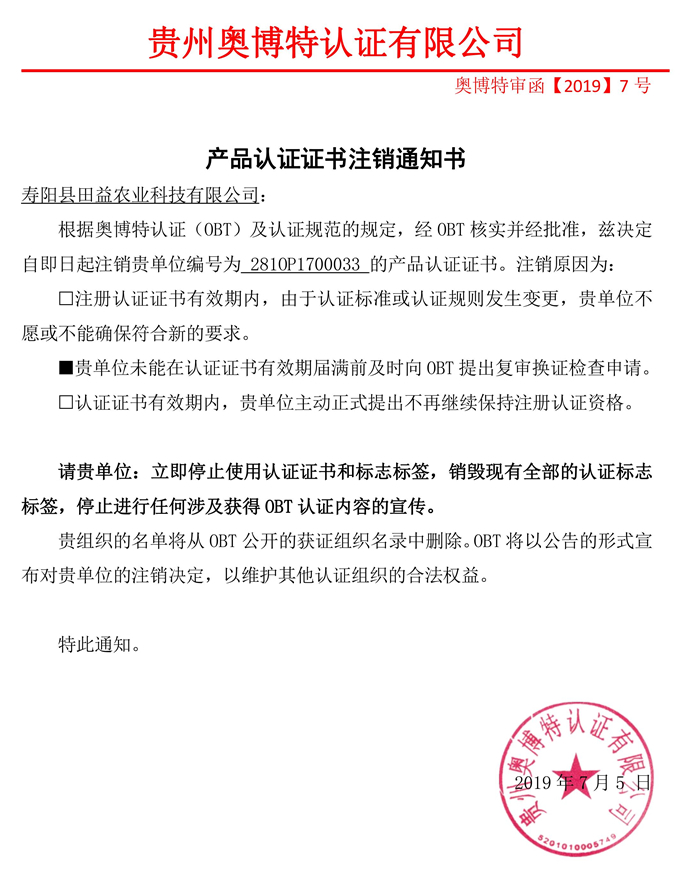 注銷壽陽縣田益農(nóng)業(yè)科技有限公司產(chǎn)品認(rèn)證證書通知