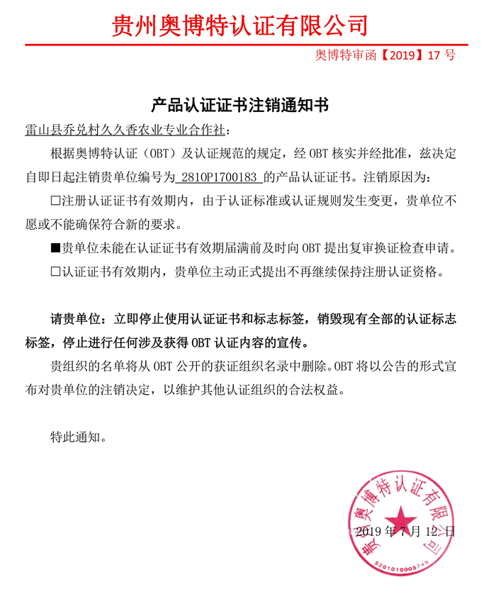 注銷雷山縣喬兌村久久香農業專業合作社產品認證證書通知