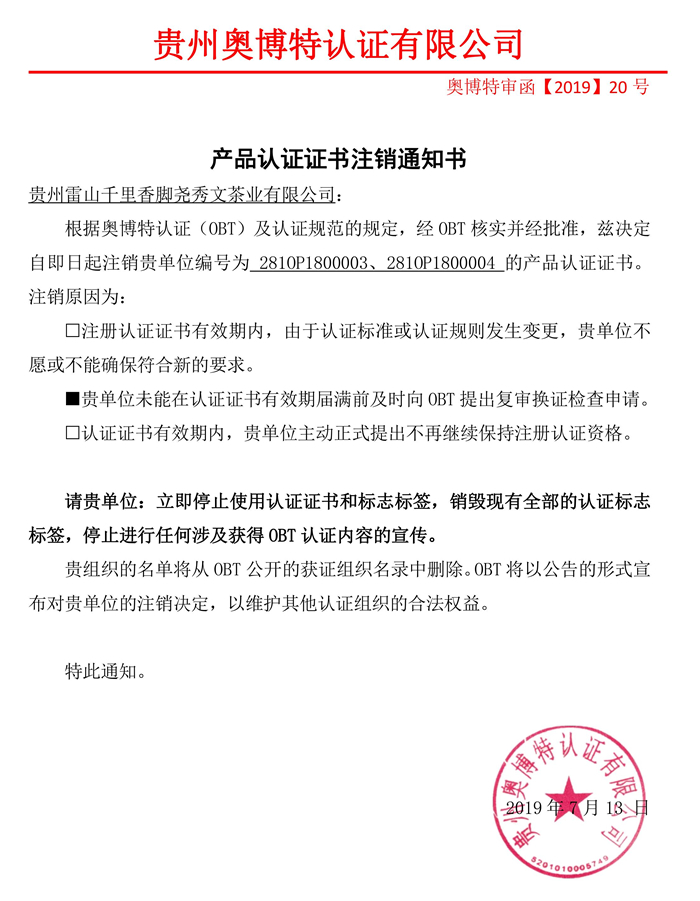 注銷貴州雷山千里香腳堯秀文茶業有限公司產品認證證書通知