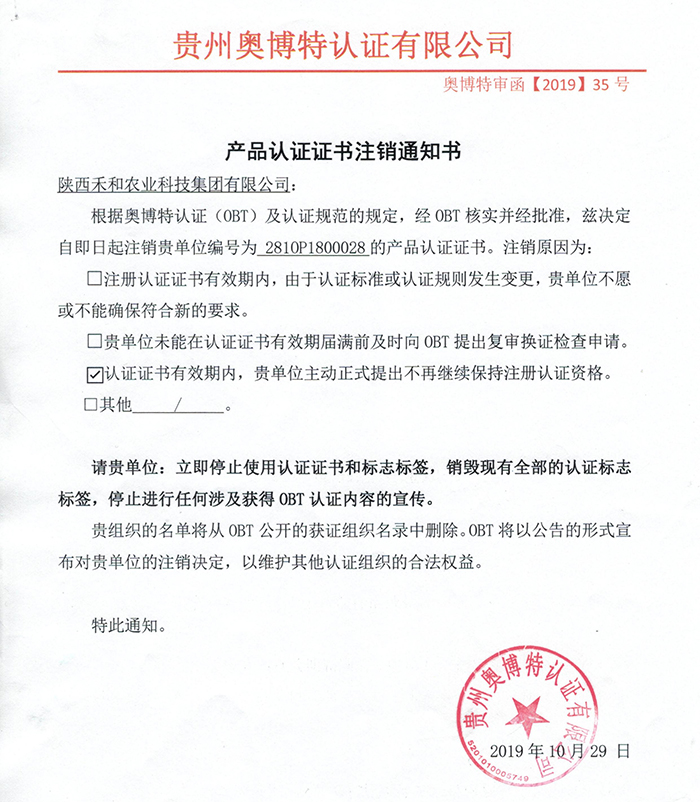 注銷(xiāo)陜西禾和農(nóng)業(yè)科技集團(tuán)有限公司產(chǎn)品認(rèn)證證書(shū)通知