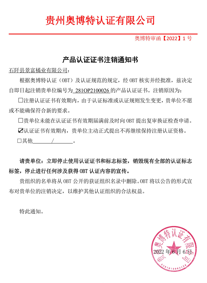 注銷石阡縣景富橘業(yè)有限公司產(chǎn)品認(rèn)證證書通知